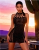 Standard Product Name: Black, high-elasticity nylon spandex yarn, front and back cross-distribution splicing halter tie, rhinestones, M/XL, two sizes, women`s halter rhinestone bodycon bodysuit.